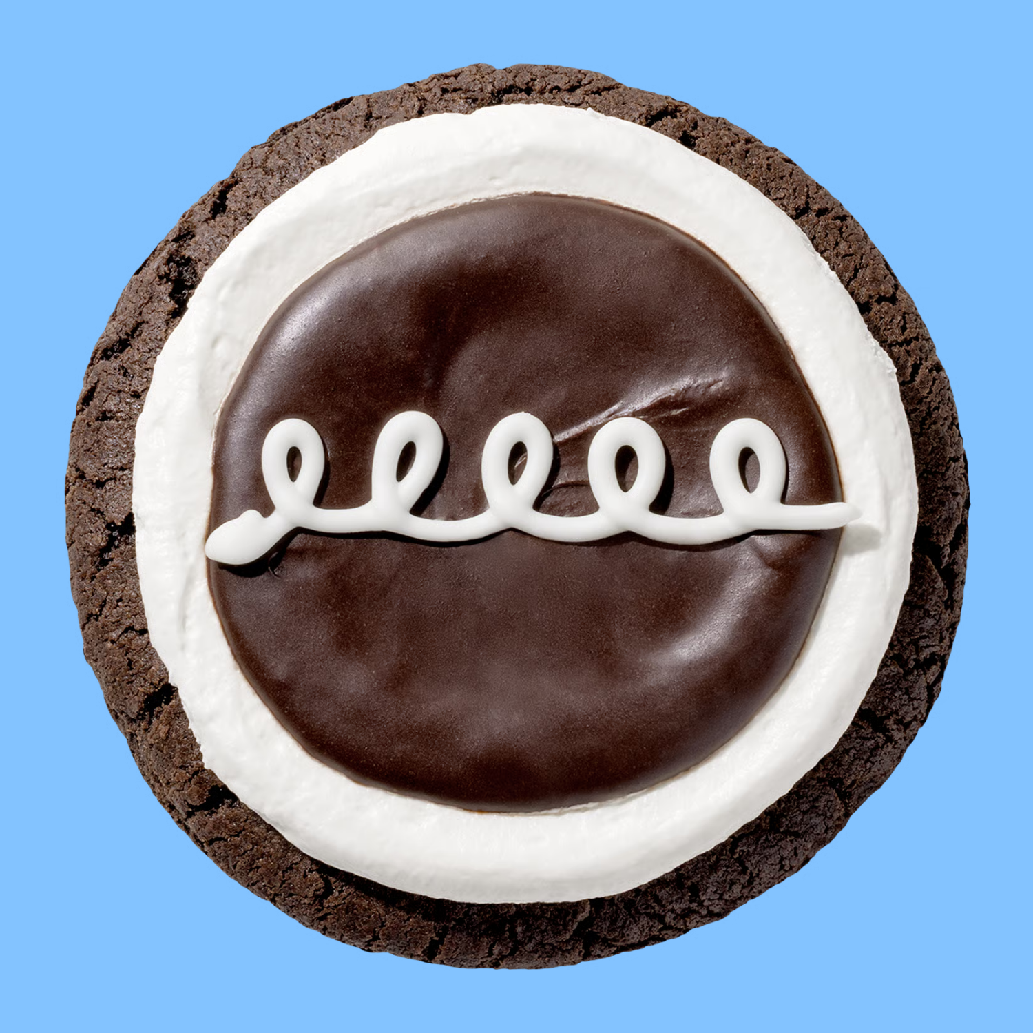 A chocolate cake cookie smothered with a layer of fluffy marshmallow whipped cream, gooey chocolate glaze, and decorative white loops.